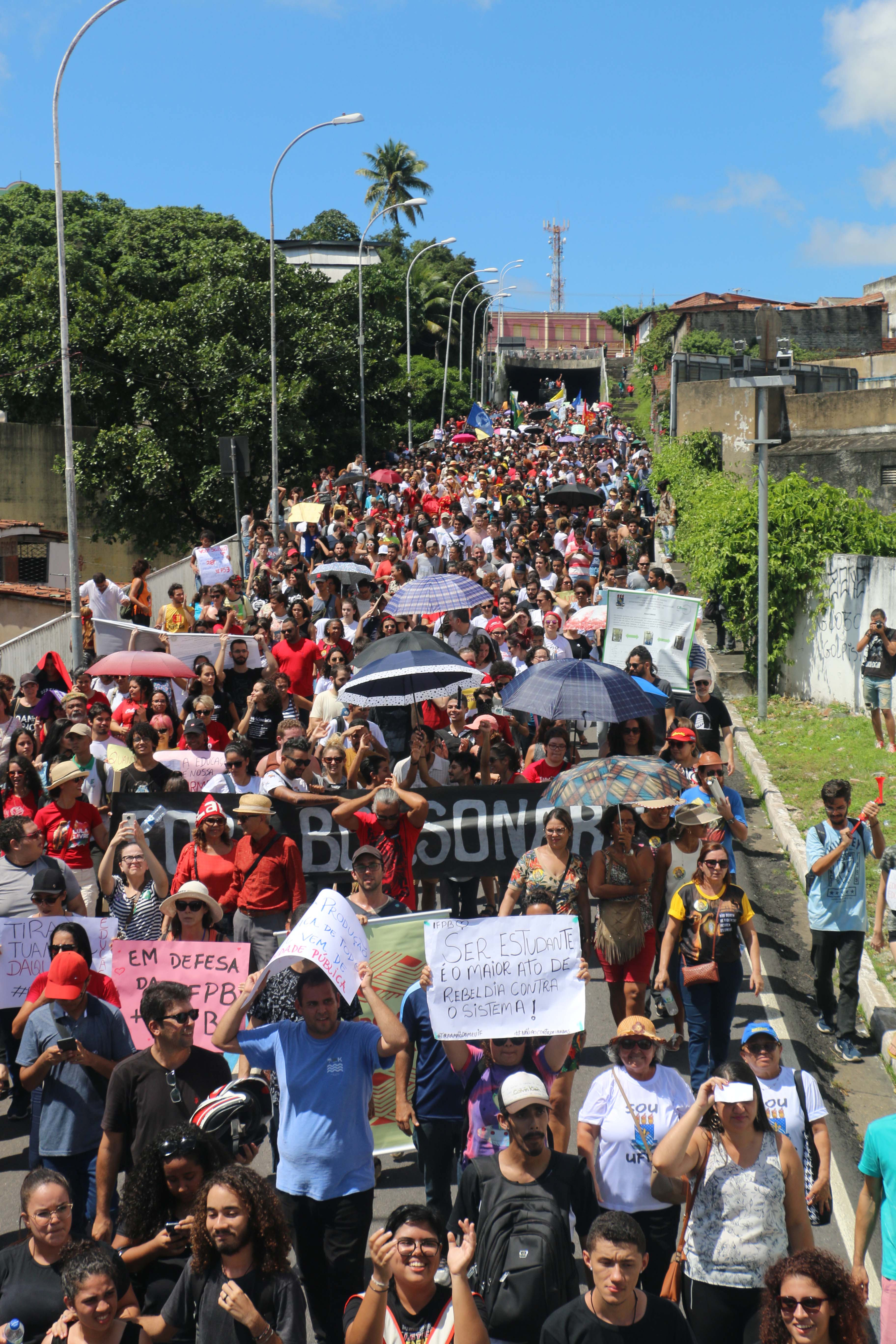 As principais cidades paraibanas registraram protestos contra os ataques do governo Bolsonaro às Instituições Federais de Ensino (IFEs). Em João Pessoa, mais de 30 mil manifestantes foram às ruas com cartazes, faixas, bandeiras, carros de som e palavras de ordem. Atos públicos também ocorreram nas cidades de Campina Grande, Sousa, Patos, Cuité, Guarabira, Monteiro, Bananeiras, Areia, Rio Tinto, Sumé e Sapé.