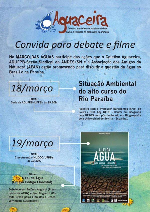 O Coletivo Aguaceira e a Apan (Associação Paraibana dos Amigos da Natureza) promovem nesta quarta-feira (18/3), na sede da ADUFPB, um debate sobre o tema “Situação ambiental do alto curso do Rio Paraíba”. O evento começará às 19h30 e terá palestra com Bartolomeu Israel de Souza, professor adjunto da UFPB, doutor em Geografia pela UFRGS,…