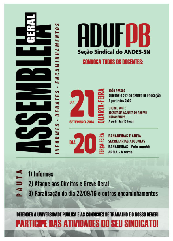 Os ataques aos direitos dos trabalhadores e as propostas de greve geral e de paralisação no dia 22 de setembro serão os principais assuntos da rodada de assembleias que a ADUFPB realiza na próxima semana. Na terça-feira (20/9), as discussões serão realizadas nos campi de Bananeiras (manhã) e Areia (à tarde), nas respectivas secretarias adjuntas…