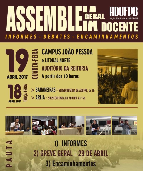 A construção da greve geral convocada pelas centrais sindicais de todo o Brasil para o dia 28 de abril será o principal tema de debate da próxima rodada de assembleias dos professores da UFPB. As atividades serão realizadas nesta terça-feira (18), nos campi de Bananeiras e Areia, e na quarta-feira (19), em João Pessoa e…