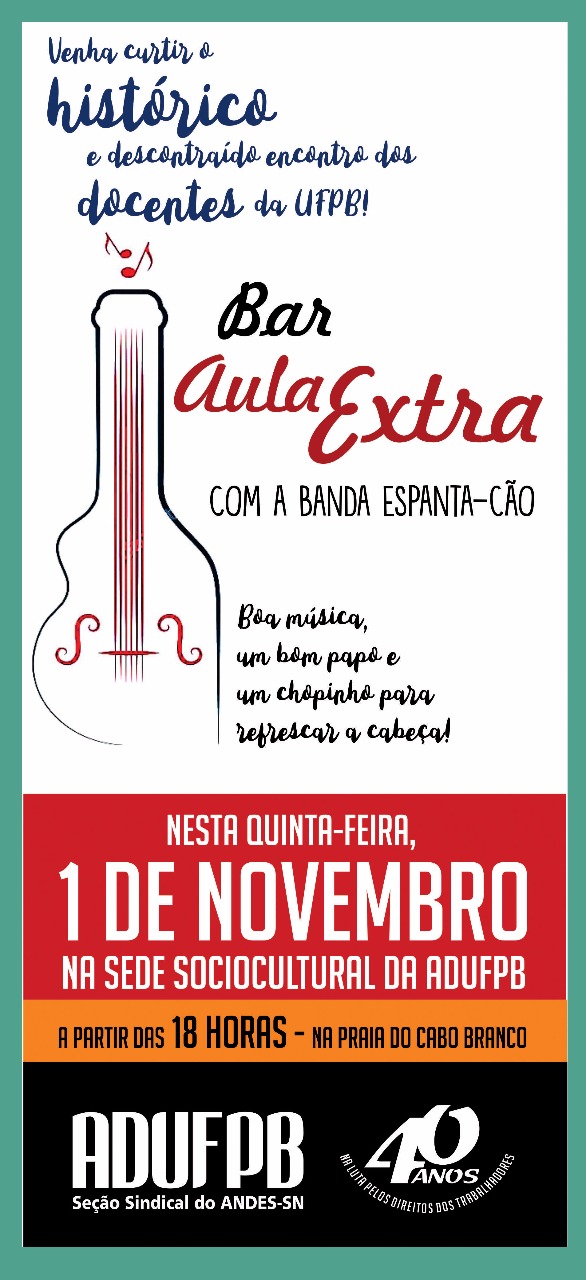 Evento encerra a programação cultural dos 40 anos da ADUFPB A programação cultural das comemorações dos 40 anos de luta da ADUFPB – Seção sindical do ANDES na Paraíba faz uma homenagem ao Bar Aula Extra, encontro eventual realizado pelos docentes da UFPB na sede do sindicato, no Campus I da UFPB nos anos de…