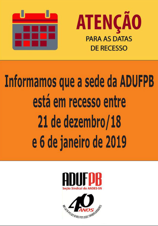 O fim de ano está aí e a ADUFPB avisa aos sindicalizados que a sede administrativa do Centro de Vivência da UFPB terá horário especial de funcionamento. Veja na lista abaixo: Dia 19 de dezembro – sede estará fechada o dia todo; Dia 20 de dezembro – funcionará das 13h às 18h; Dia 21 de dezembro –…