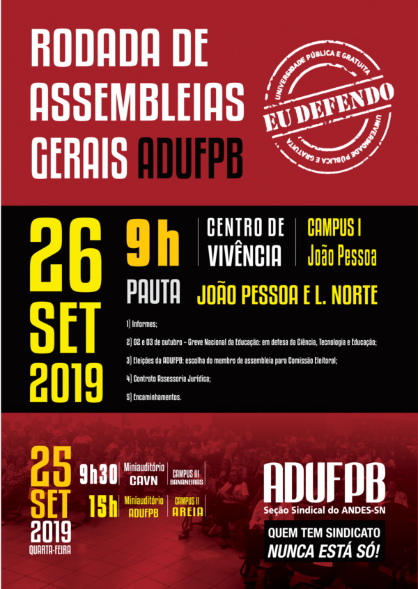 Os professores da UFPB voltam a se reunir em assembleia geral na próxima quarta-feira, 25/9, em Bananeiras e Areia, e na quinta-feira, 26/9, em João Pessoa, com integração dos docentes do campus IV (Litoral Norte). Na quarta-feira, 25/9, a partir das 9h30, terá início a assembleia em Bananeiras (no miniauditório do CAVN, Campus III). A…
