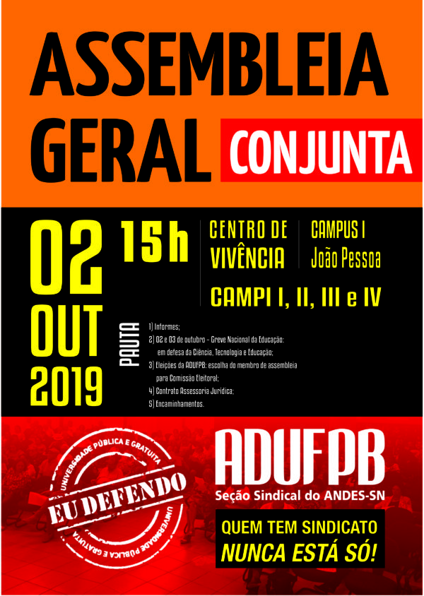 ADUFPB realiza dia 02 de outubro Assembleia Geral Conjunta em João Pessoa e mesa redonda em Areia
