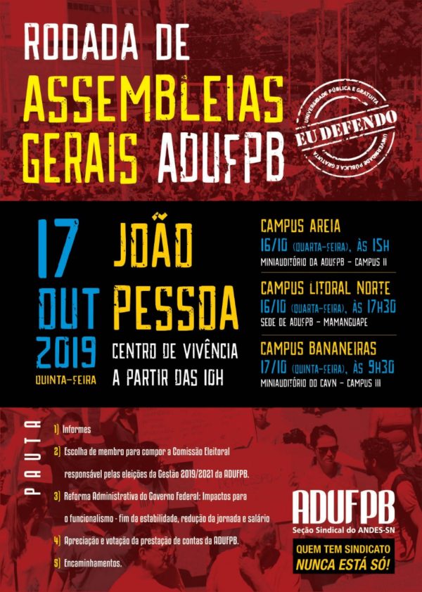 O Dia dos Professores será comemorado nesta terça-feira, 15 de outubro, com atividades culturais e políticas organizadas pela ADUFPB. A data também marca o retorno às aulas e início do período 2019.2. No campus I, em João Pessoa, a partir das 9h, será oferecido um café da manhã aos docentes no Terraço Cultural Silvio Frank…