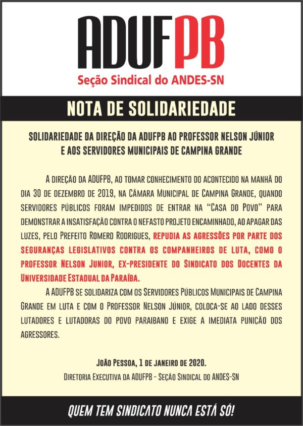 NOTA DE SOLIDARIEDADE DA DIREÇÃO DA ADUFPB AO PROFESSOR NELSON JÚNIOR E AOS SERVIDORES MUNICIPAIS DE CAMPINA GRANDE A direção da ADUFPB, ao tomar conhecimento do acontecido na manhã do dia 30 de dezembro de 2019, na Câmara Municipal de Campina Grande, quando servidores públicos foram impedidos de entrar na “Casa do Povo” para demonstrar…