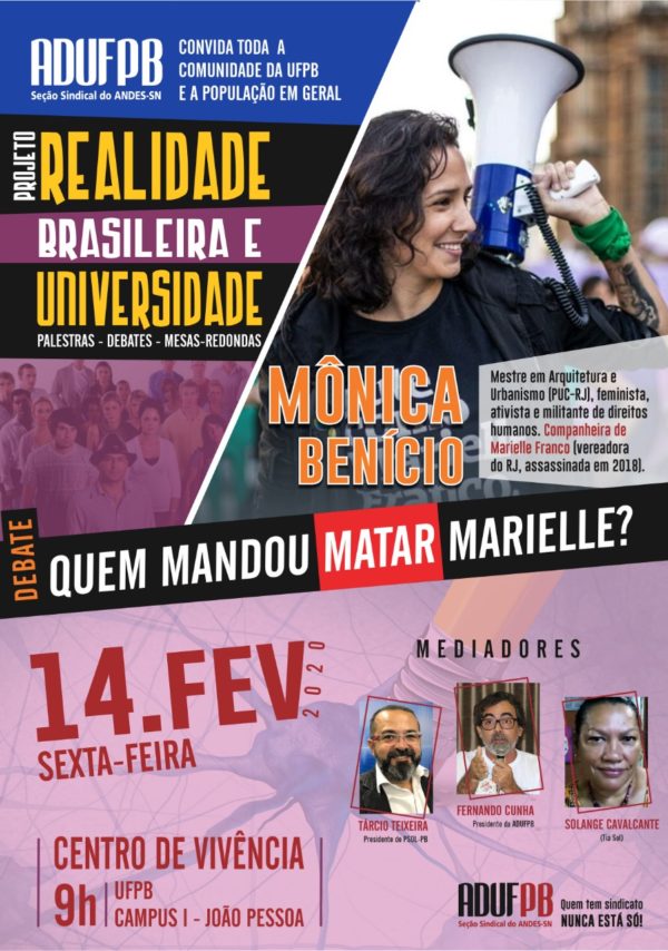 “Quem mandou matar Marielle?” A primeira edição de 2020 do projeto “Realidade Brasileira e Universidade”, organizado pela ADUFPB, traz para o debate um crime que vem revelando ao mundo inteiro a ação da milícia carioca: o assassinato da vereadora Marielle Franco. A convidada é a arquiteta e ativista Mônica Benício, companheira de Marielle. O evento,…