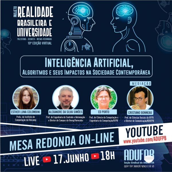 O projeto Realidade Brasileira e Universidade chega, esta semana, à 10ª edição online com um debate sobre “Inteligência Artificial, Algoritmos e seus Impactos na Sociedade Contemporânea”. O evento será realizado por videoconferência na quarta-feira, 17/6, às 18h, com transmissão simultânea pelo canal da ADUFPB no Youtube (www.youtube.com/ADUFPB). Participam do debate a professora Esther Luna Colombini…