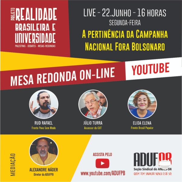 Os debatedores desta edição foram Rud Rafael, representante da Frente Povo Sem Medo, Elida Elena, da Frente Brasil Popular, e Júlio Turra, assessor da CUT – Central Única dos Trabalhadores. A mediação do evento foi realizada pelo professor Alexandre Náder, representante da Diretoria Executiva da ADUFPB.