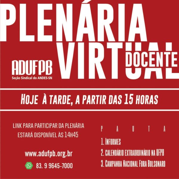 A ADUFPB promove nesta quinta-feira, 25/6, uma plenária docente aberta aos professores e professoras da UFPB. Em atendimento às medidas de isolamento social para prevenção da covid-19, o evento será realizado totalmente online por meio da plataforma de videoconferência Zoom. A pauta será: informes, calendário extraordinário na UFPB e campanha nacional Fora Bolsonaro. A plenária…