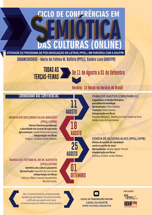 Começa nesta terça-feira (11/8) o Ciclo de Conferências em Semióticas das Culturas. O evento é online e está sendo organizado pelo Programa de Pós-graduação em Letras (PPGL) da Universidade Federal da Paraíba, em parceria com a ADUFPB. As atividades irão ocorrer ao longo das próximas quatro semanas, sempre às terças-feiras, às 15h, com encerramento no…