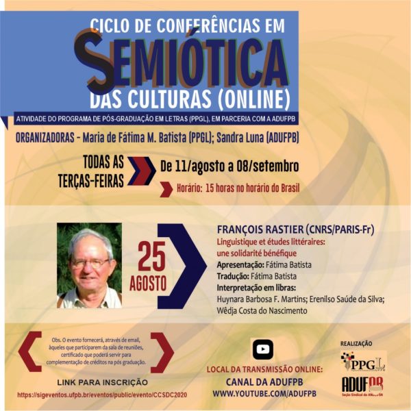 O Programa de Pós-graduação em Letras (PPGL) da Universidade Federal da Paraíba, em parceria com a ADUFPB, realiza nesta terça-feira (25/8), às 15h, mais uma atividade do Ciclo de Conferências em Semióticas das Culturas. O evento será online, com transmissão pelo Youtube, e terá como convidado o pesquisador francês François Rastier (CNRS/Paris-Fr), que abordará o…