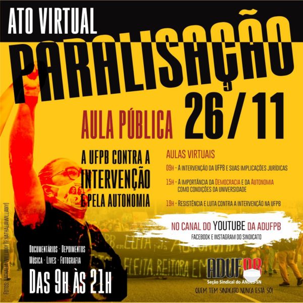Os professores da UFPB realizam nesta quinta-feira (26/11) um dia de paralisação contra a intervenção e em defesa da autonomia universitária. Como estratégia de mobilização e conscientização, será realizada uma grande aula pública virtual, com transmissão pelo canal da ADUFPB no YouTube (www.youtube.com/ADUFPB). A atividade terá 12 horas de duração, começando às 9h e se…