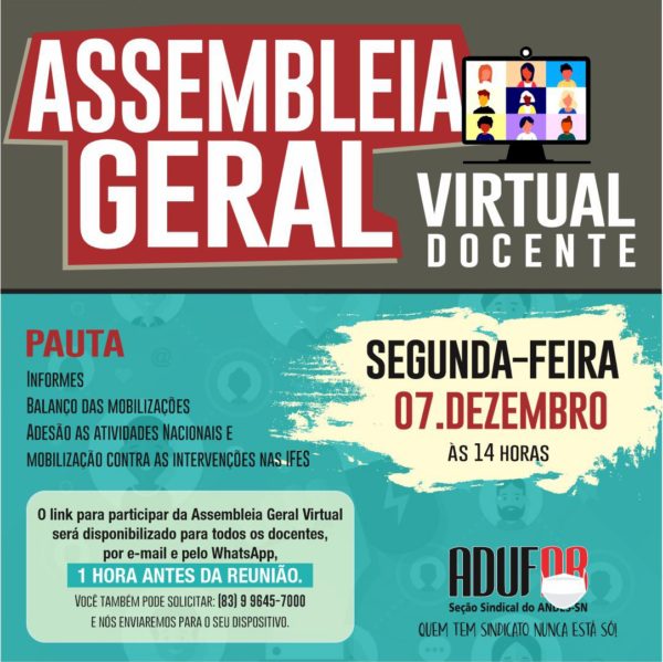 A ADUFPB realiza nesta segunda-feira, 7 de dezembro, uma assembleia docente virtual para fazer uma avaliação das últimas mobilizações contra a intervenção na UFPB e discutir a adesão da categoria às atividades nacionais que estão se organizando para enfrentar o autoritarismo do governo federal. A atividade será realizada, a partir das 14h, por meio da…