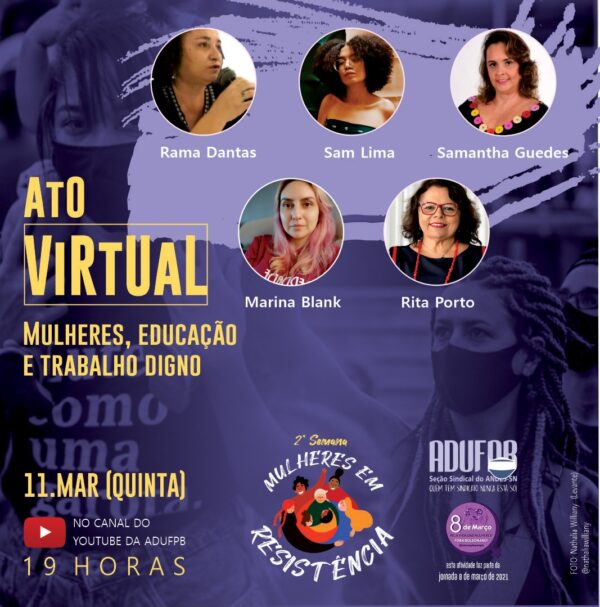 A programação da Semana Mulheres em Resistência, organizada pela ADUFPB, termina nesta quinta-feira (11) com um ato virtual, a partir das 19h. Participam da atividade representantes de movimentos de mulheres e pesquisadoras, que irão falar sobre o tema “Mulheres, educação e trabalho digno”, definido em plenária pelas lideranças da Jornada 8 de Março na Paraíba.…