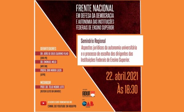 Os ataques do governo federal à autonomia universitária voltam a ser tema de debate no próximo dia 22 de abril no canal da ADUFPB no Youtube. Representantes da Ordem dos Advogados do Brasil (OAB), do Ministério Público Federal (MPF) e professores federais participam do seminário regional “Aspectos jurídicos da autonomia universitária e o processo de…
