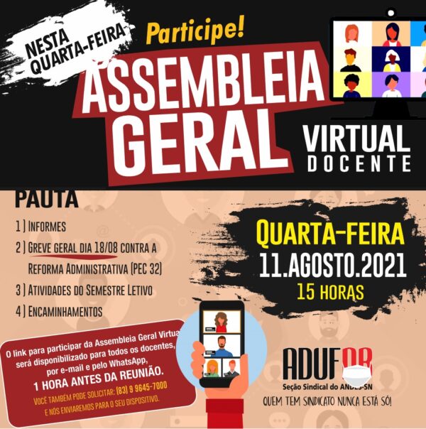 A adesão de professoras e professores da UFPB à greve geral dos servidores públicos será o tema principal da pauta da assembleia docente que a ADUFPB realiza nesta quarta-feira, dia 11 de agosto, a partir das 15h. Como vem ocorrendo desde o início da pandemia, a atividade será virtual, por meio da plataforma de videoconferência…
