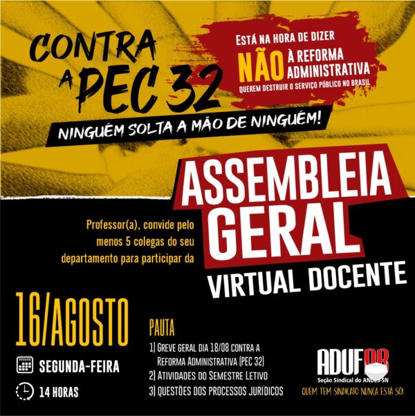 Greve geral dos servidores, assuntos jurídicos e atividades do semestre letivo. Esses serão os pontos de pauta da próxima assembleia docente virtual que a ADUFPB realizará na segunda-feira, dia 16. O link de acesso será disponibilizado para os docentes por e-mail (adufpb@terra.com.br) e pelo Whatsapp (83.99645-7000) na manhã do evento. Também estará disponível no site…