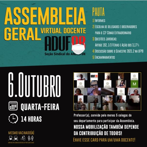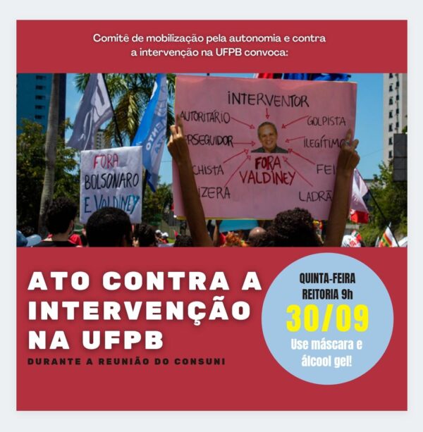 O Comitê de Mobilização pela Autonomia e contra a Intervenção na UFPB está convocando toda a comunidade universitária a participar, nesta quinta-feira (30/9), de um grande ato em frente ao prédio da reitoria do campus I da universidade, em João Pessoa. A atividade está marcada para as 9h, mesmo horário em que irá ocorrer uma…