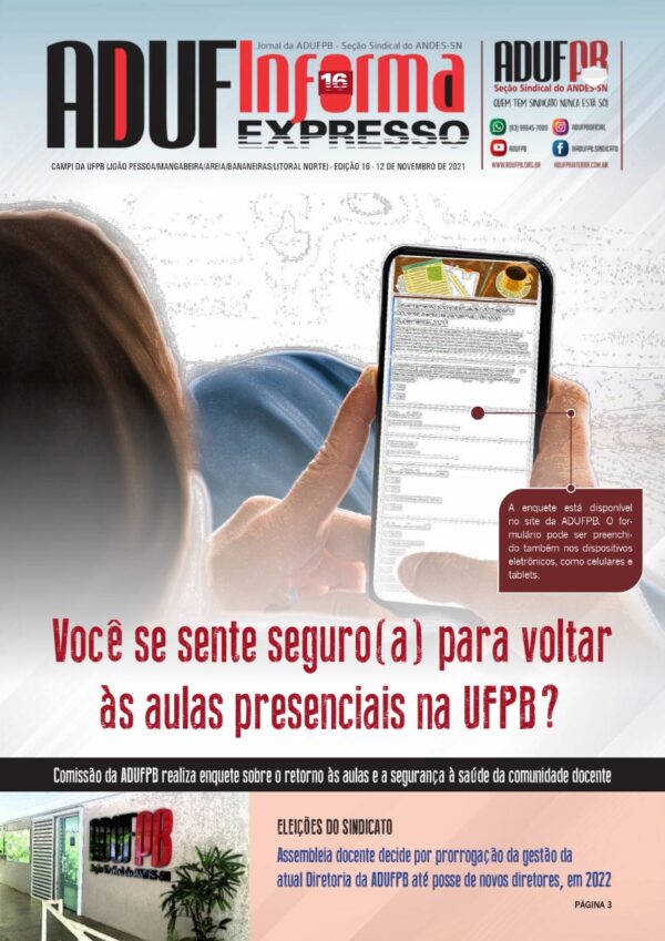 A 16ª edição do jornal AdufInforma Expresso traz, nesta sexta-feira (12), um convite da Comissão Docente para todos participarem da enquete lançada esta semana, sobre a retomada das atividades presenciais. Além dessa matéria, há informações sobre a última assembleia, a parceria entre a ADUFPB e o Observatório de Imprensa da Paraíba e a Plenária Nacional…