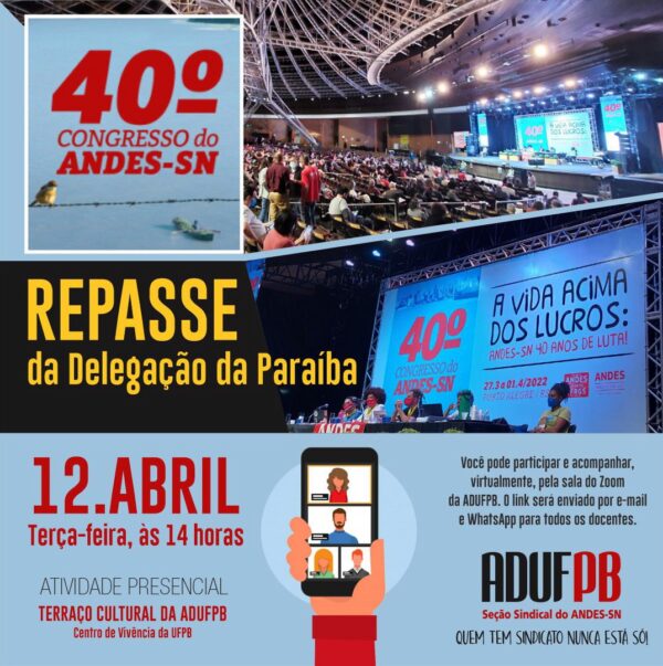 A ADUFPB realiza nesta terça-feira (12/4) uma reunião híbrida para repasse dos informes do 40º Congresso do Andes-SN. A atividade será no Terraço Cultural da ADUFPB, no Centro de Vivência do campus I. Quem não puder participar de forma presencial poderá assistir pelo Zoom. Iremos distribuir o link uma hora antes por e-mail e Whatsapp.…