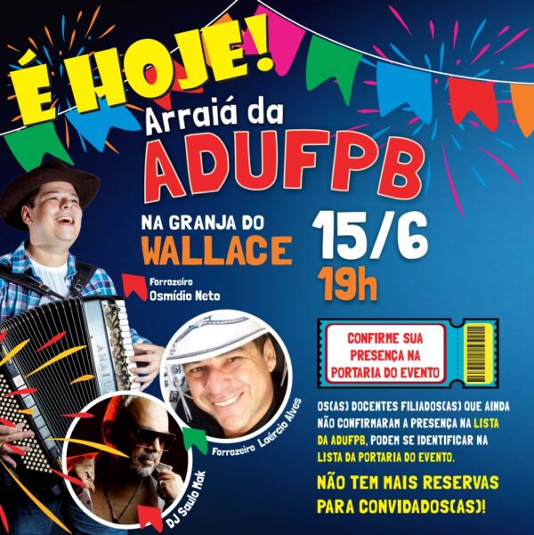 Hoje é dia de arraial! Já está tudo pronto para a festa de São João da ADUFPB, que acontece nesta quarta-feira (15), a partir das 19h, na Granja do Wallance, no bairro Portal do Sol, em João Pessoa. E atenção: terminou agora pela manhã o prazo para confirmação de presença, que estava sendo feita na…
