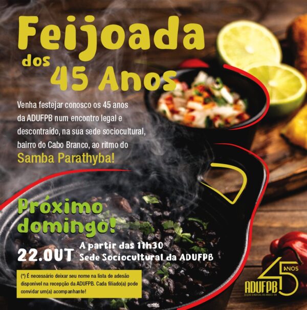 A ADUFPB promoverá mais um encontro festivo para celebrar o seu aniversário. Desta vez, será a “Feijoada dos 45 Anos”, que acontecerá na sede sociocultural da entidade, localizada no bairro do Cabo Branco, a partir das 11h30 deste domingo (22). O momento de descontração será animado pelo som do grupo Samba Parathyba. Para ter acesso…