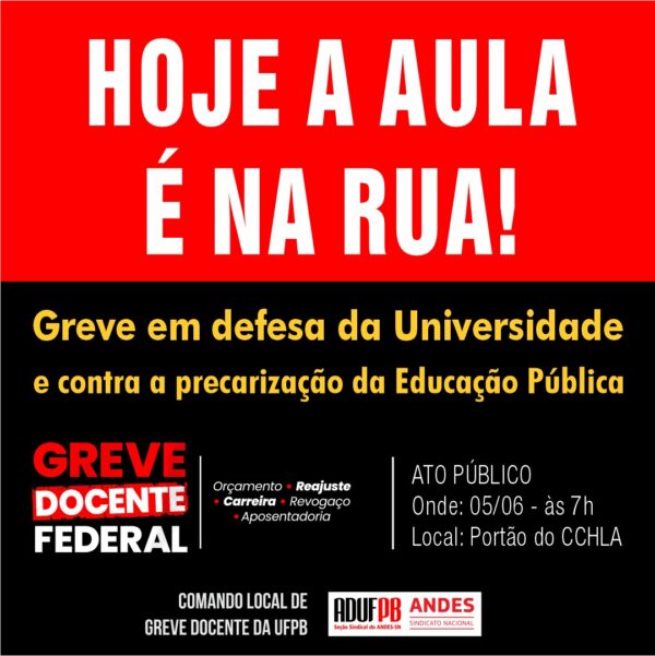 No dia 3 de junho, teve início a greve docente na UFPB. A aula agora é na rua, em defesa da universidade pública, por reajuste salarial e carreira docente, pela recomposição orçamentária nas universidades, pelos direitos dos aposentados, contra a intervenção na reitoria, contra a precarização na educação! O Comando de Greve convoca a comunidade…