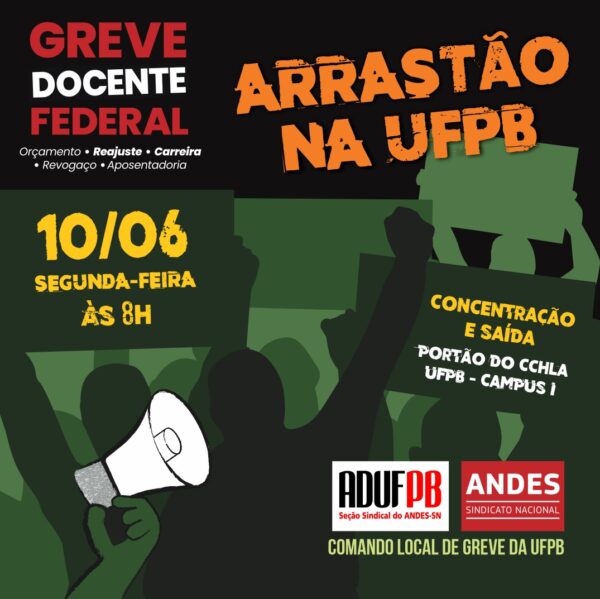 Em meio à greve que se iniciou no dia 3 de junho, os professores da Universidade Federal da Paraíba (UFPB), organizados pelo Comando Local de Greve Docente, realizarão uma grande atividade de mobilização nesta segunda-feira, dia 10 de junho. O evento será um “Arrastão na UFPB” e terá concentração às 8h no portão do CCHLA,…