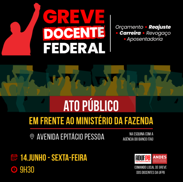 O Comando Local de Greve dos Docente da UFPB convoca as professoras e os professores da Universidade Federal da Paraíba, e também toda a sociedade, para participarem nesta sexta-feira, 14, a partir das 9h30, de um ato público que será realizado em frente ao Ministério da Fazenda, na Avenida Epitácio Pessoa. A ação faz parte…