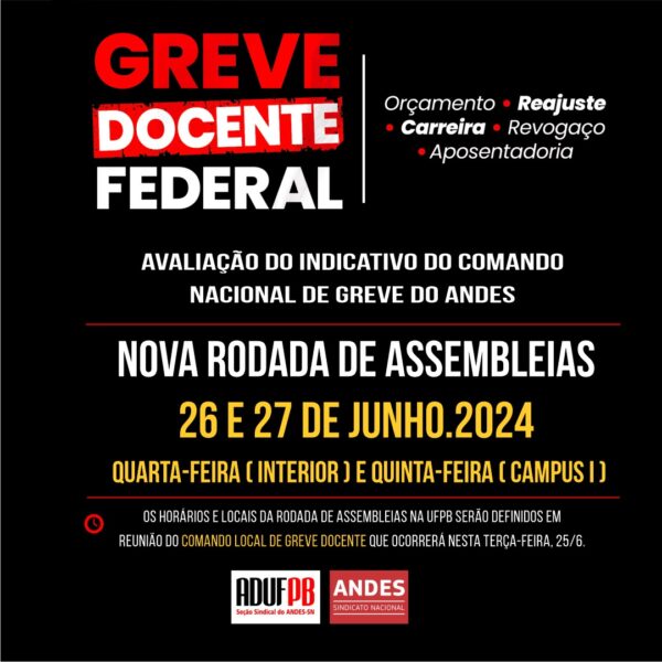 O Comando Local de Greve Docente da UFPB informa que, conforme decidido pela categoria nos dias 18 e 19 deste mês, uma nova rodada de assembleias será realizada nesta semana, na quarta e quinta-feira (26 e 27), nos quatro campi da universidade. Em pauta estará a avaliação do indicativo do Comando Nacional de Greve do…