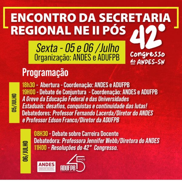 A ADUFPB vai sediar, na sexta-feira (5) e no sábado (6) o Encontro da Secretaria Regional Nordeste II Pós do Andes – Sindicato Nacional, que debaterá a conjuntura política, a carreira docente, a greve das Instituições Federais de Ensino, os desafios para a continuidade da luta e as Resoluções do 42º Congresso do Sindicato Nacional,…