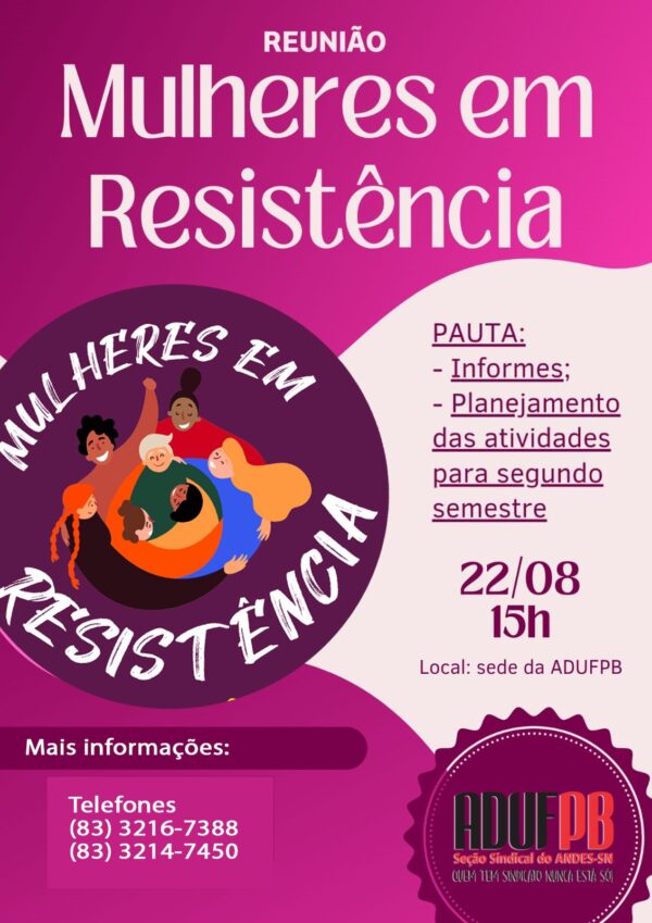 O Comitê Mulheres em Resistência da ADUFPB realiza nesta quinta-feira (22/8) o planejamento das atividades para o segundo semestre. A reunião será às 15h, na sede da ADUFPB, localizada no Centro de Vivência do campus I. O Comitê Mulheres em Resistência da ADUFPB foi formado em 2020, como resultado da Semana Mulheres em Resistência, iniciativa que…