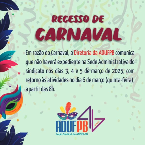 Recesso de Carnaval: sedes da ADUFPB em João Pessoa e no interior fecham nos dias 3, 4 e 5