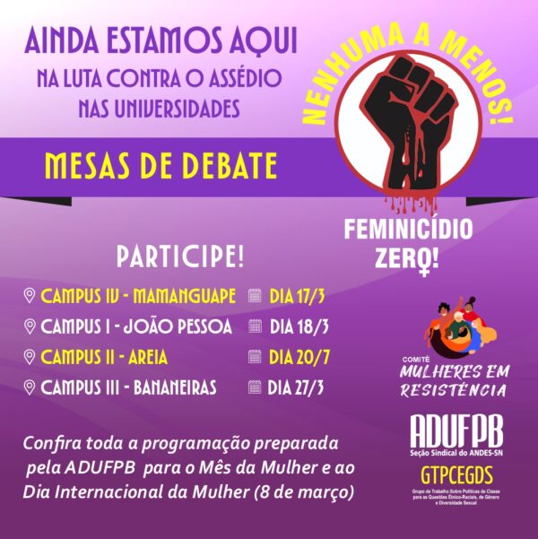 Começa nesta segunda-feira (17) a série de debates organizados pela ADUFPB, dentro da programação alusiva ao Dia Internacional da Mulher. Os eventos serão realizados nos quatro campi da UFPB e têm como objetivo discutir e sensibilizar toda a sociedade em torno da questão do assédio às mulheres, tanto na política quanto nas universidades públicas. A…
