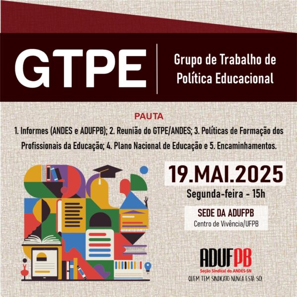 O Grupo de Trabalho de Política Educacional (GTPE) da ADUFPB convida todos(as) os(as) docentes interessados a participar da reunião que será realizada na próxima segunda-feira (19). A atividade ocorrerá na sede da ADUFPB, no Centro de Vivência do campus I, a partir das 15h. A pauta será formada pelos seguintes pontos: informes (ANDES e ADUFPB),…