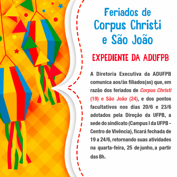 Sede da ADUFPB estará fechada durante feriadão de Corpus Christi (19/6) e de São João (24/6). Atividades retornam dia 25/6 (quarta-feira)