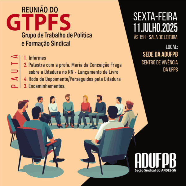 O Grupo de Trabalho de Política e Formação Sindical (GTPFS) da ADUFPB reúne-se na próxima sexta-feira (11/7) para tratar sobre os encaminhamentos propostos pelos GTs de política e formação sindical do ANDES, além de planejar a realização de uma palestra com a socióloga e historiadora Maria da Conceição Fraga, da UFRN, e o lançamento de…