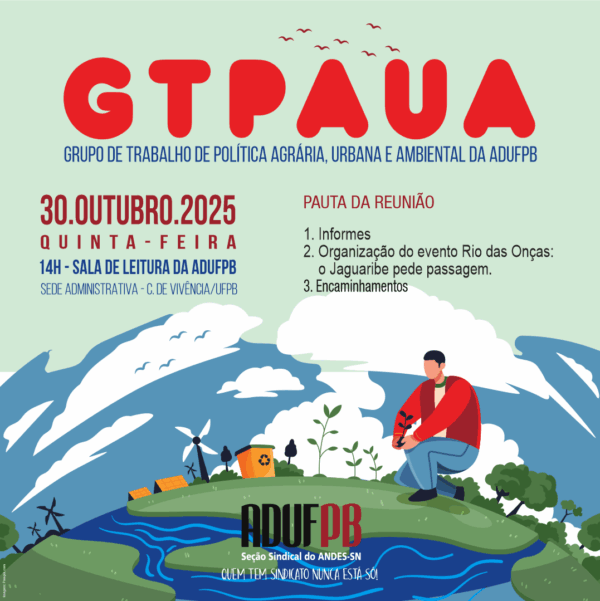 O Grupo de Trabalho de Política Agrária, Urbana e Ambiental (GTPAUA) da ADUFPB promove, nesta sexta-feira (30), mais uma reunião na sede do sindicato, localizada no Centro de Vivência do campus I da Universidade Federal da Paraíba (UFPB). O encontro será realizado a partir das 14h, na Sala de Leitura da ADUFPB. Na pauta estão…