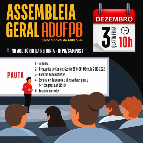 A ADUFPB realiza nos dias 3, 4, 5 e 9 de dezembro mais uma rodada de assembleias gerais nos quatro campi da UFPB. Em pauta, estarão os seguintes temas: informes, prestação de contas – Gestão 2018-2019/Gestão 2019-2022, Reforma Administrativa, escolha de delegados e observadores para o 44º Congresso do Andes-SN, encaminhamentos. No dia 3 (quarta-feira),…