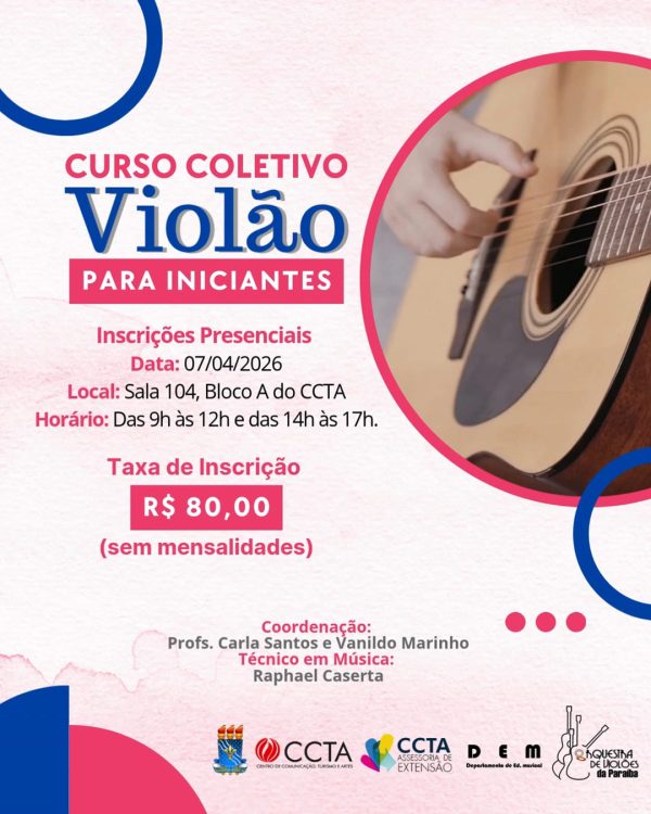 A Orquestra de Violões da Paraíba (OVPB), vinculada ao Departamento de Educação Musical da Universidade Federal da Paraíba (UFPB), está com 156 vagas abertas para o Curso Coletivo de Violão para Iniciantes. A iniciativa é destinada a pessoas a partir dos 12 anos, contemplando tanto iniciantes quanto aqueles que desejam aprimorar conhecimentos básicos no instrumento.…