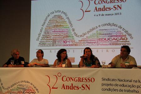 Faltavam poucos minutos para as 6h de domingo (10), quando a presidente do ANDES-SN, Marinalva Oliveira, declarou encerrado o 32º Congresso do ANDES-SN no Rio de Janeiro. Foram praticamente sete dias de intensas discussões, sejam nas plenárias ou nos grupos mistos de trabalho, das quais resultaram os eixos e estratégias de luta que irão orientar a atuação da entidade em 2013, nas mais diversas frentes.