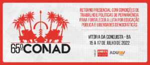 A diretoria do ANDES-SN convocou, nesta sexta-feira (06), o 65º Conad do Sindicato Nacional, que ocorrerá de 15 a 17 de julho. Com tema central “Retorno presencial com condições de trabalho e políticas de permanência para fortalecer a luta por Educação Pública e liberdades democráticas”, o evento acontecerá na Universidade Estadual do Sudoeste da Bahia (Uesb), em Vitória da Conquista (BA), sob organização da Associação de Docentes da Uesb – Seção Sindical do ANDES-SN (Adusb SSind.).