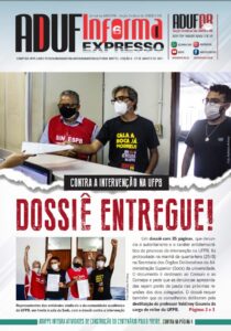 A sexta edição do jornal AdufInforma Expresso já está disponível e traz a cobertura do ato público realizado esta semana em frente ao prédio da reitoria e a entrega do dossiê sobre a intervenção na UFPB pedindo a destituição do professor Valdiney Gouveia do cargo de reitor. O documento foi organizado pelo Comitê de Mobilização pela Autonomia e contra a Intervenção, formado por representantes dos professores, dos servidores técnico-administrativos e dos estudantes, é destinado ao Consuni e ao Consepe e pede que as denúncias apresentadas sejam ponto de pauta nas próximas reuniões dos dois colegiados.