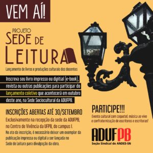 A ADUFPB sugere aos docentes interessados em participar do Sede de Leitura que inscrevam as suas obras o mais breve possível. Assim, a assessoria de comunicação do sindicato fará a divulgação individual das publicações, à medida que elas forem sendo inscritas. A proposta é ampliar o tempo de divulgação das obras e atingir um público maior de interessados para o evento.