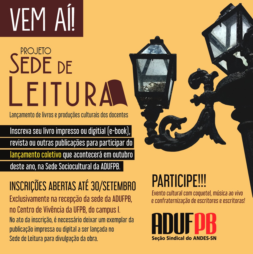 Já estão abertas as inscrições para mais uma edição do projeto Sede de Leitura, promovido pela ADUFPB. O evento proporciona o lançamento coletivo de livros impressos, e-books, revistas e outras publicações (impressas ou digitais) de autoria de professores e professoras sindicalizados, numa festa consagrada pela interação literária entre autores e autoras. A expectativa é de que esta edição atraia mais participantes do que as anteriores, já que o sindicato não realizava outro Sede de Leitura desde a pandemia de covid-19.