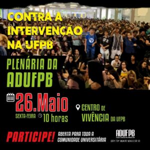 A Diretoria Executiva da ADUFPB e o Conselho de Representantes da entidade convocam os(as) docentes e a comunidade acadêmica para uma plenária na próxima sexta-feira (26) com o objetivo de discutir o processo de intervenção na Universidade Federal da Paraíba (UFPB). A atividade ocorrerá no Centro de Vivência do campus I, em João Pessoa, a partir das 10h.