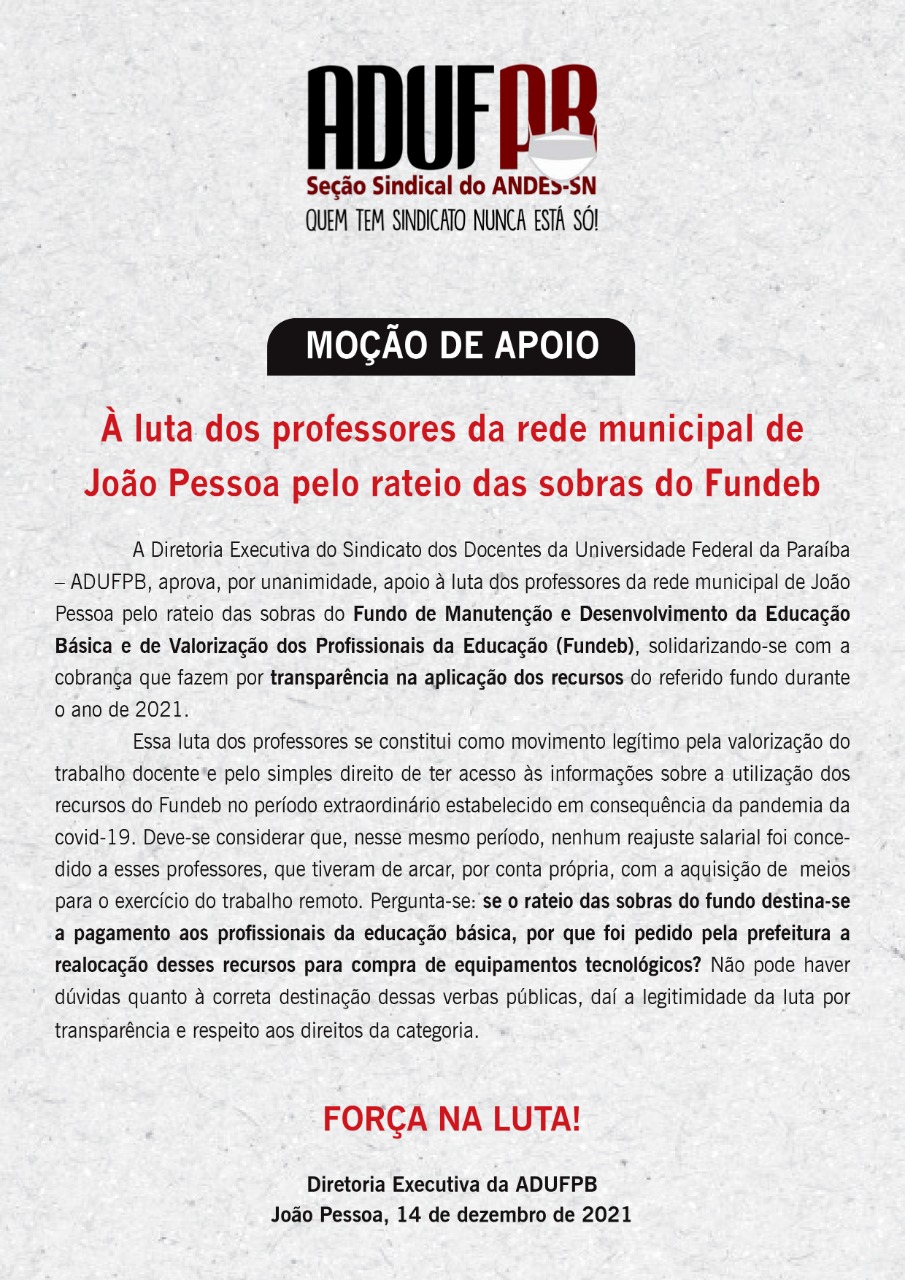 A ADUFPB divulgou nesta quarta-feira (15/12) uma moção de apoio aos professores da rede municipal de ensino de João Pessoa, que cobram da Prefeitura o rateio das sobras do Fundeb (Fundo de Manutenção e Desenvolvimento da Educação Básica e de Valorização dos Profissionais da Educação).