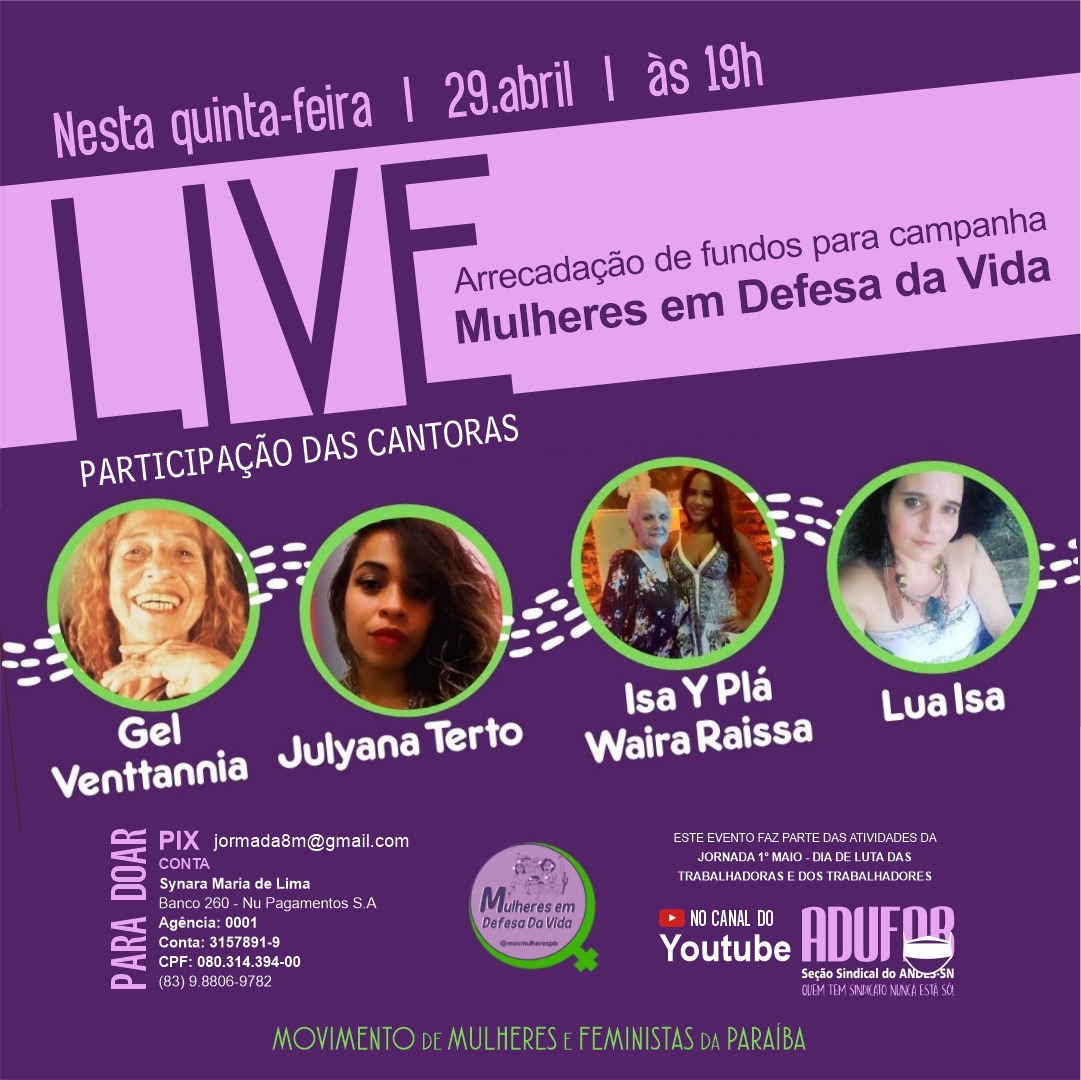 Com apresentações das cantoras Gel Venttannia, Julyana Terto, Isa Y Plá, Waira Raissa e Lua Isa, a live contará também com falas políticas de representantes tanto da ADUFPB, quanto do Movimento de Mulheres e Feministas da Paraíba.