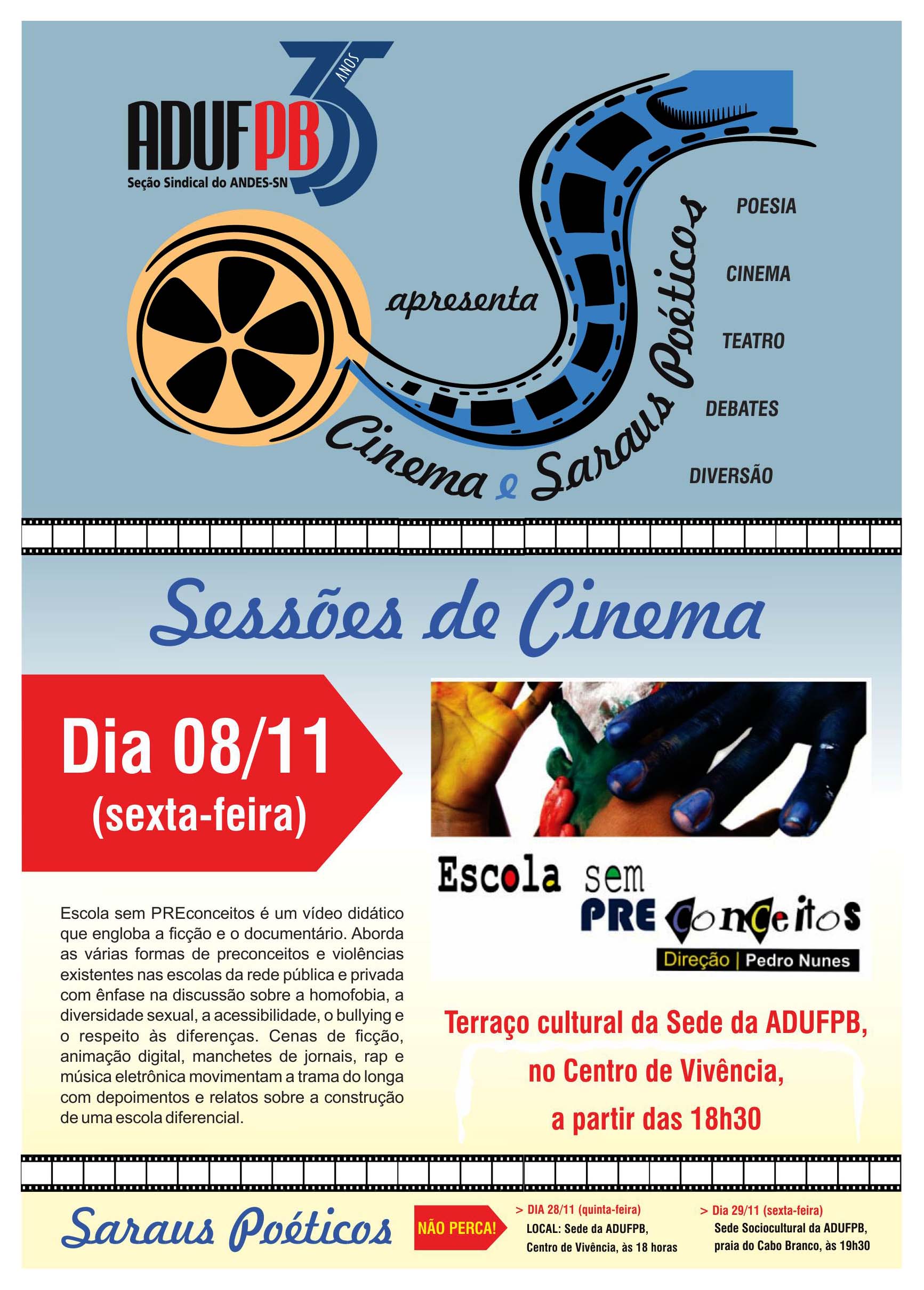 Será realizada na próxima sexta-feira (8/11) a terceira sessão de cinema promovida pela ADUFPB dentro do calendário de atividades culturais do sindicato para este segundo semestre. Desta vez, estará em cartaz o vídeo didático intitulado “Escola sem PREconceitos, dirigido pelo professor Pedro Nunes, com produção executiva de Elton Bruno Pinheiro. A exibição será às 18h30, na sede da ADUFPB, localizada no Centro de Vivência do campus I, em João Pessoa.